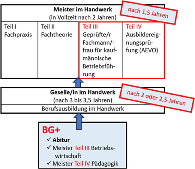 Vertiefende betriebswirtschaftliche sowie berufs- und arbeitspädagogische Kenntnisse werden entsprechend den Meistermodulen III und IV bereits während Ihrer dreijährigen Abiturlaufbahn erworben – und das nicht umsonst, sondern kostenlos! Sie sparen Zeit und Geld, wenn Sie sich für eine handwerkliche Karriere mit Meistertitel im Anschluss an das Abitur entschließen.